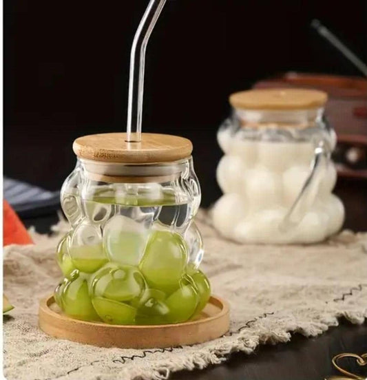 Grape-shaped High Borosilicate Glass Mug with wooden lid and glass straw